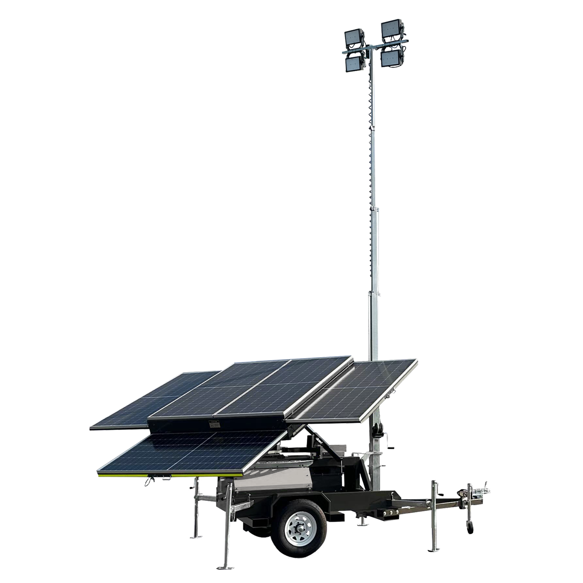 | Mounting | Fixture: Pole Mount Mast: 225° rotatable, 5-sections pole. Includes a 2,500 lb winch to manually telescope pole up to 27’3”(8.35m) Solar Panels: Manual sliding guide rails Includes a 2,500 lb winch to manually set up sun angle (7.5°-32°) Base: 2-Wheel Trailer with 4 retractable jacks. (Max speed 62mph) |