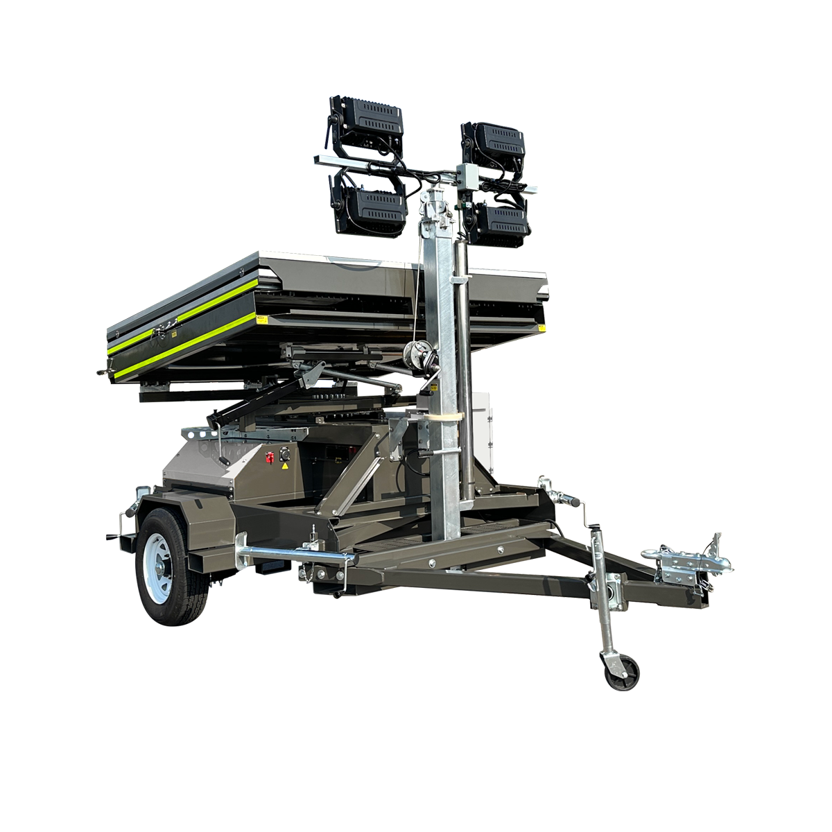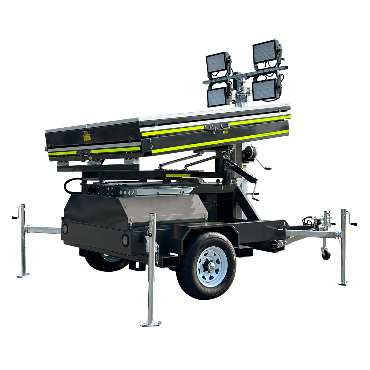 - Two 180W LEDs (54K lumens) – Brighter than diesel towers, without the fumes
